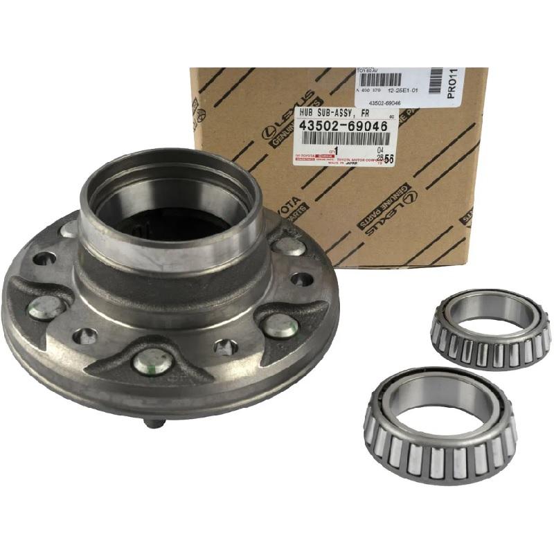Etupyörän napa oikea/ vasen + pyörän laakerit Toyota Land Cruiser HDJ80/ HZJ80/ FJ80. Vastaavia varaosanumeroita: 43502-60040, 43502-69045.