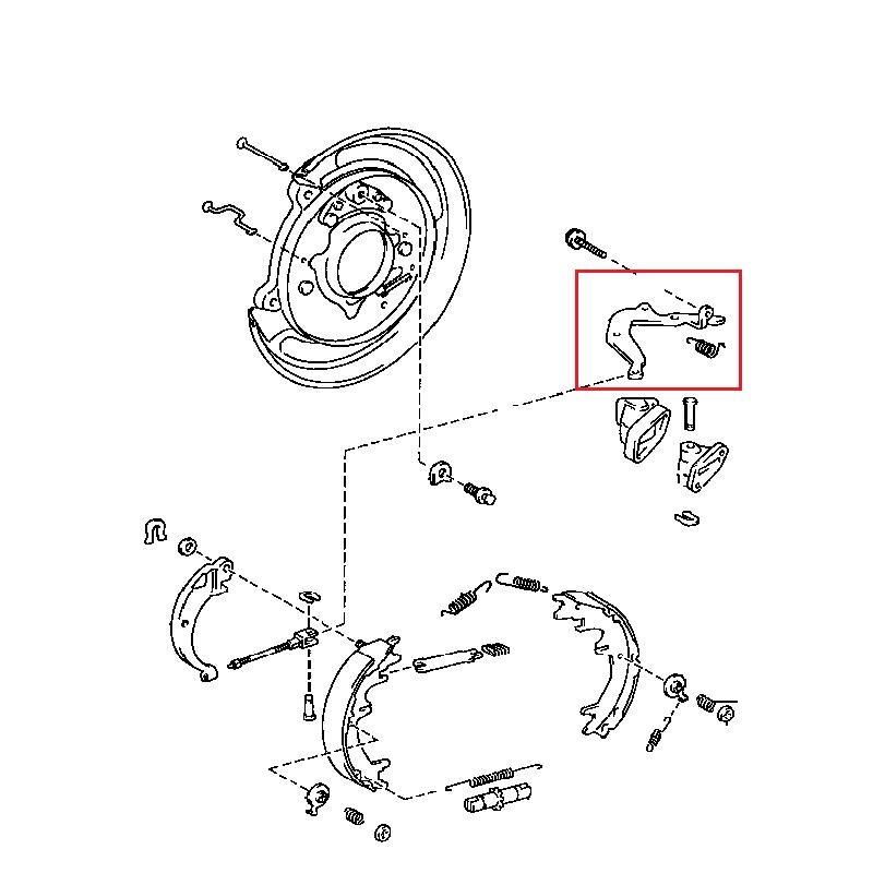 Käsijarrukenkien sisempi käyttövipu vasemmalle puolelle 47625-60020. Sijaitsee rummun sisällä.