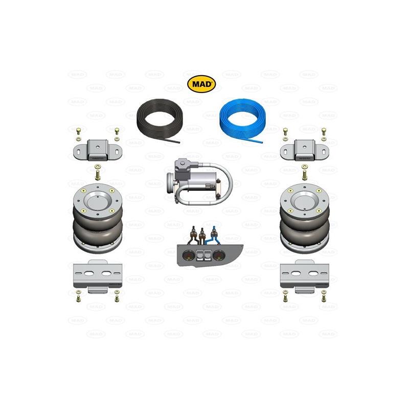 MAD lisäilmajousisarja NR-137574-CS on auton omaa jousitusta tukeva järjestelmä jossa molempien takajousien ja rungon väliin asennetaan ilmapussit paremman kantavuuden, maavaran ja ajettavuuden lisäämiseksi. Molempien ilmajousien painetta voidaan säätää erikseen ohjaamoon sijoitettavalla säätöpanelilla. Ihanteellinen sarja käytettäväksi ajoneuvoissa joiden kuorma vaihtelee paljon. Ilmapussikohtainen säätö on erinomainen apu kun kuorma ei ole jakautunut tasaisesti lavalle vaan painoa on jommalla kummalla puolella enemmän. Tyhjänä ajaessa voidaan ilmapalkeet tyhjentää ja auto on alkuperäisen mukava ajaa.