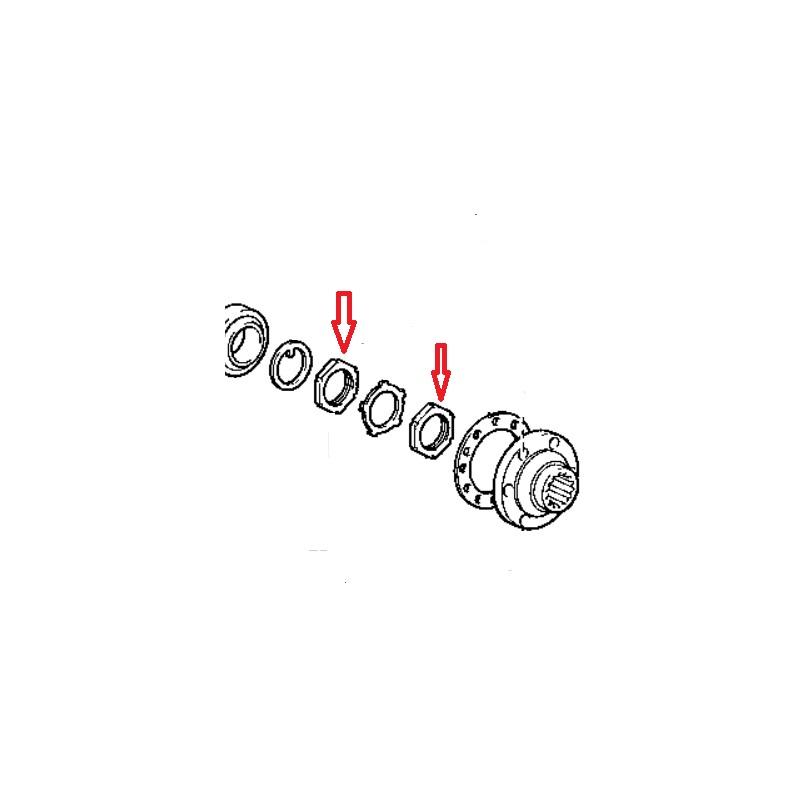 Lukitusmutteri etupyörän laakerille, akselilla 2kpl sisempi ja ulompi (välissä lukituslevy). Toyota Land Cruiser HJ, BJ, LJ, RJ, HDJ, HZJ, Hilux 4WD, Hiace 4WD.
