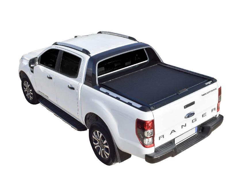 Tessera Roll Cover – rullattava alumiinista valmistettu matta musta lavakansi SOT 1308 ROLL Ford Ranger Wild Trak Double Cab malleihin alkuperäisellä lavakaarella 2012 eteenpäin. Erittäin tukeva rakenne Anti-Theft alumiinisaranoilla takaa erinomaisen turvan lavalla oleville tavaroille.