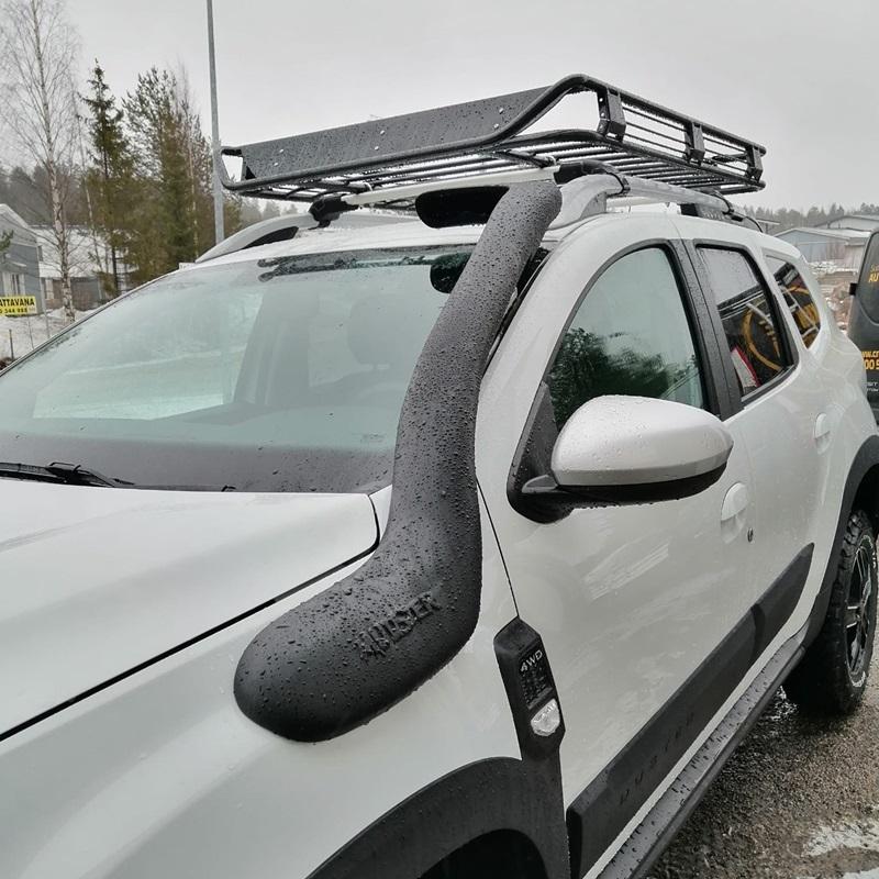 Snorkkeli Dacia Dusteriin 2018 eteenpäin. Snorkkeli siirtää moottorin ilmanoton katon korkeudelle pois tien pölystä ja vedestä ja varmistaa moottorin puhtaan ja viileän ilman saannin kaikissa olosuhteissa. Pidentää myös moottorin ilmansuodattimen ikää.